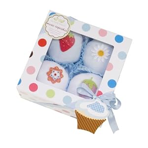 No baking is required with cupcake onesies. The Box of Four Blue and White Cupcake Onesies is for baby to put on that is comfy, practical and the perfect new baby gift. Each bakery box opens to disclose two blue onesies as well as white onesies. It is made of super soft 100% cotton, generously sized for infants 0-6 months or up to 16 pounds. Each onesie is garnished using a decorative element such as a fruit or flower. The decoration has to be removed before dressing baby. Reuse the magnetic clasp bakery box that's tied which has a ribbon and bears a present tag,