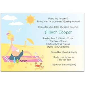 Baby Shower Invitations: "Beach Babe" features a good looking pregnant woman hanging out on the beach. This cheery and fun design has several great little touches, in the biki