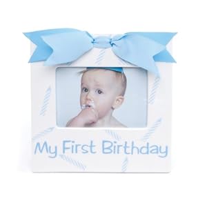 This ceramic baby photo frame features "My First Birthday" with candle decals and a double grosgrain knotted ribbon. This baby photo frame is part with the Prince baby gifts collection from Mud Pie. Dimensions are 7"x7".