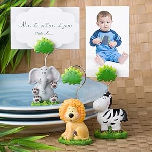 Start a stampede of fun for your event with these Jungle Critters Collection place card holders as your favors Don’t fight your animal instinct to decide on these whimsical Jungle Critters Collection place card holders for your child’s big event. They’re cute, useful and sure to please Sold only by Fashioncraft, each measures 3 3 4 tall x 1 wide which has a colorful hand painted poly resin figurine in three assorted young jungle animal shapes including a smiling lion, a waving elephant plus a proud zebra, each standing or sitting in the jungle grass below a palm tree that is attached towards the coiled silver metal place card holder - also great for holding a note or cute photo. Sure to generate your guests think that kings and queens in the jungle, these jungle theme favors come bulk packed in a ploy bag with blank cloud design place card included. These place card holders are priced individually but ship in a very 3 piece assortment. ... This unique & elegant item is a part of our exclusive Wedding Favor and Bridal - Baby Shower collection. They generate for a fantastic and different gift for the wedding reception, bridal shower, bay shower or any other special event.